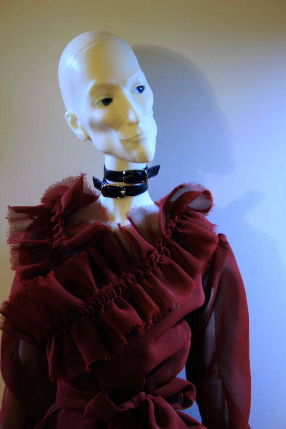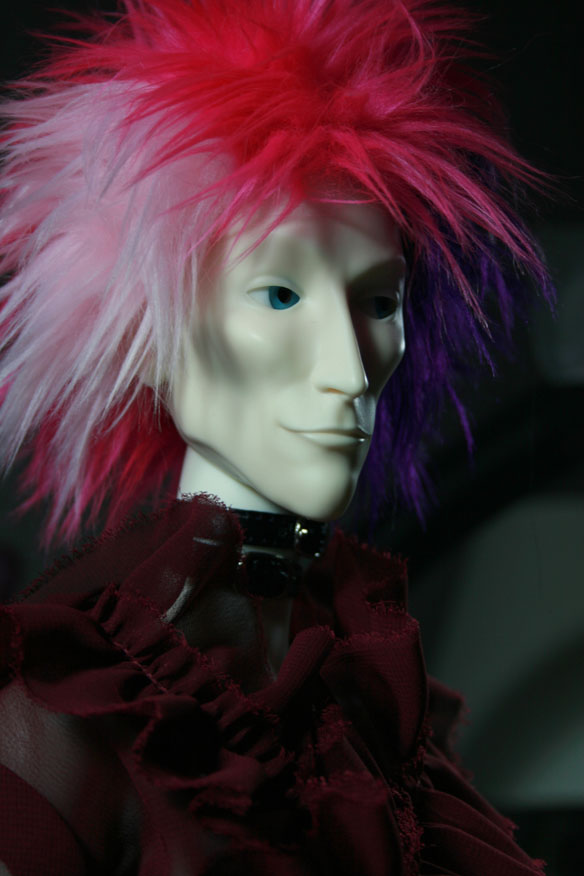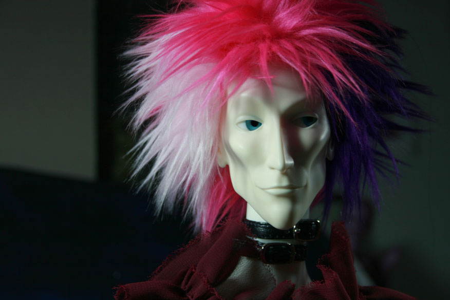 I was getting tired of tripping over Jareth's exceptionally long cape and the train on his Ringdoll Frankenstein hot pants, so I swapped him into his other outfit: a sheer red Cheerydoll blouse and black leggings with yet another pair of black platform heels [but these are only calf-high]. I tried to get a good picture of his shirt, but I have yet to figure out how to master low light conditions. Therefore you get only glimpses of his shirt and much more detailed shots of him in Janvier Jett's wig, in which he looks fucking awesome.