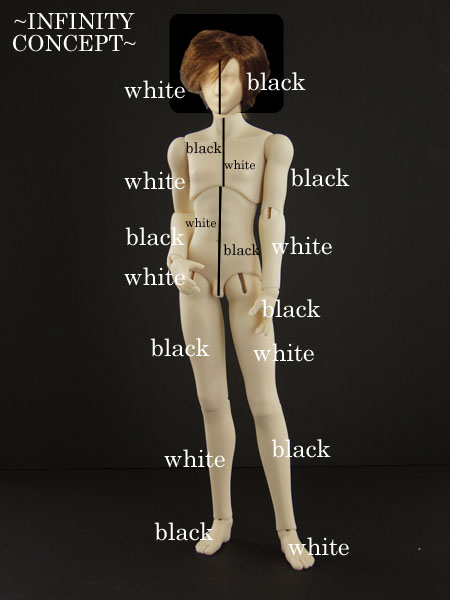 Body picture is from Lumedoll’s Web site, a photo of Lumedoll Lumelight Koit on the slim body. Head picture is from a photo of Lumelight Mini Zero on same site. Please ignore the wig. Infinity will have a fur wig, black on the left as you look at him, white on the right as you look at him, of course. No clothes or faceup, just selectively spray-painted limbs.