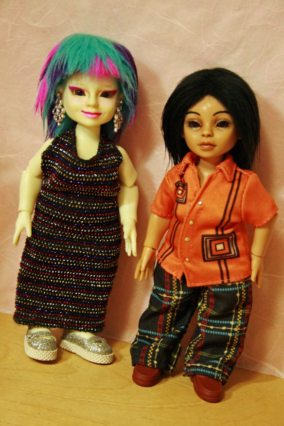 I did all the improvements that I said I would on Delphine, and here she is [at right], done, with Béatrice [at left]. Showin’ off one of my few faux furs in natural hair color!