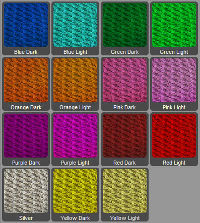 This is a set of 15 shader presets featuring seamless, tiled, sequin-like fabric for all your fabulous frippery needs! This set contains dark and light versions of the following colors: blue, green, orange, pink, purple, red, yellow. There’s also a silver shader.