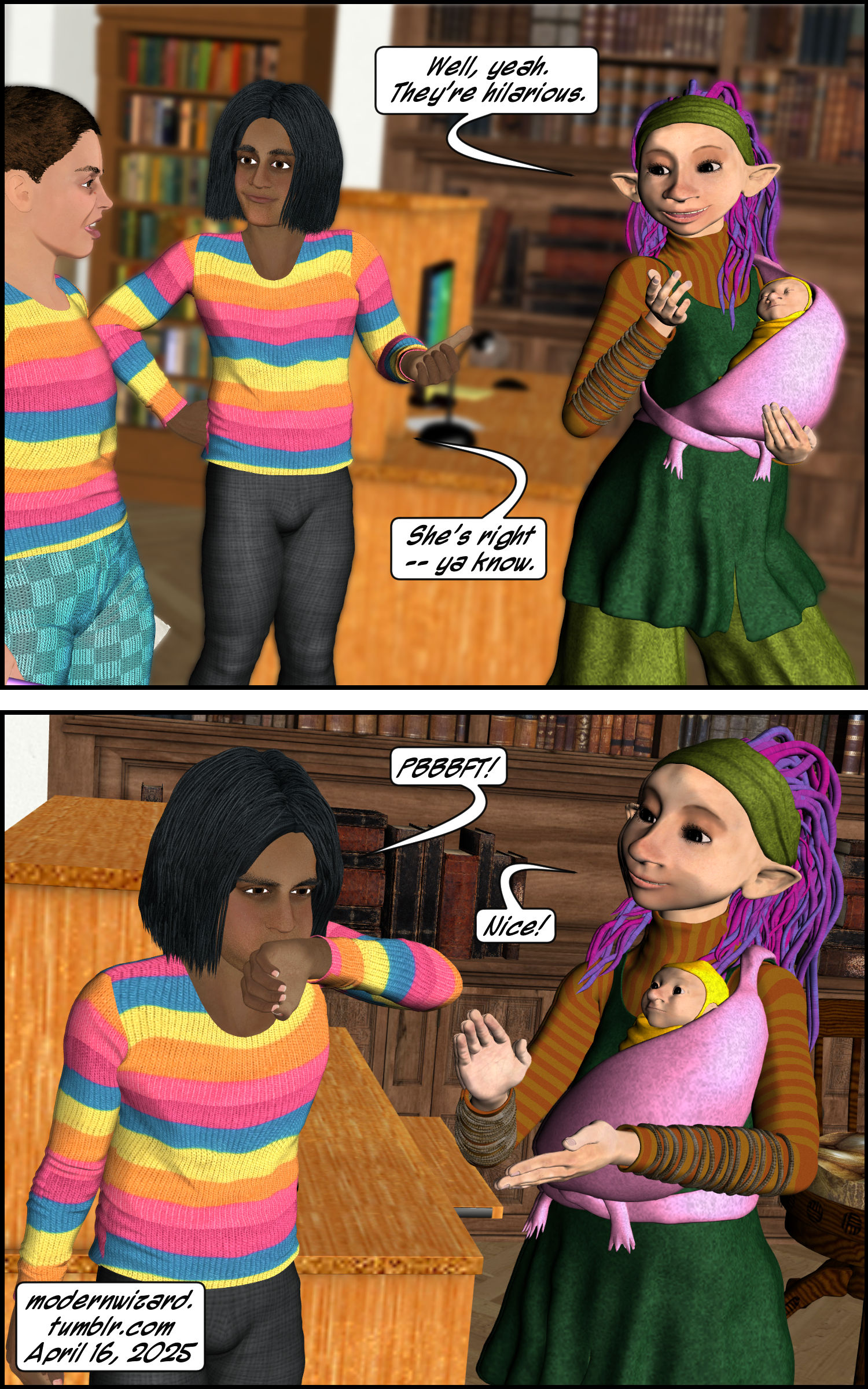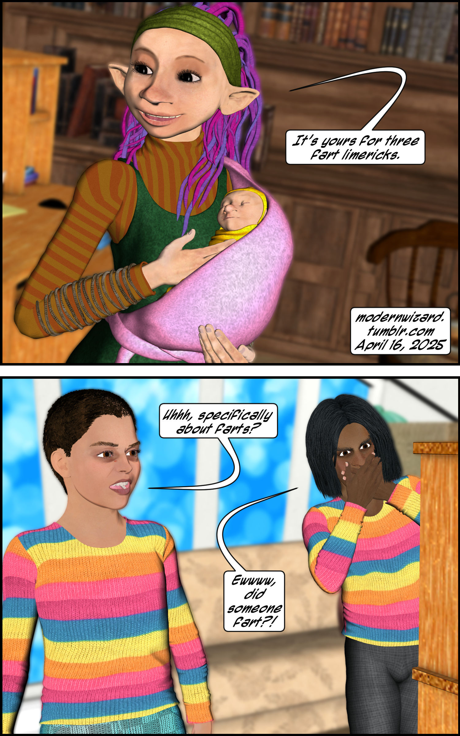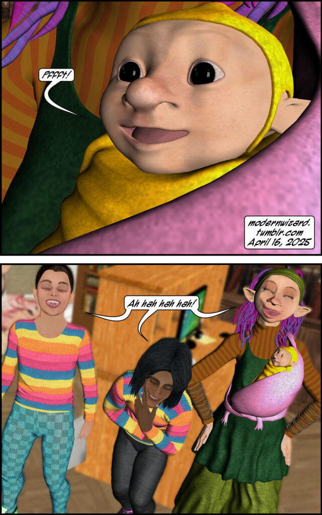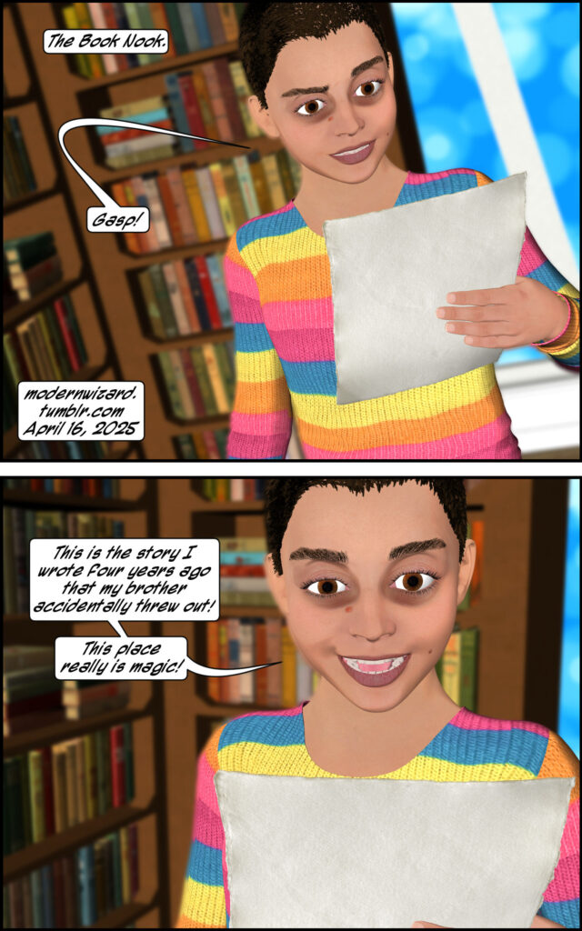 Silencitx finds a magic story in the Book Nook. Silencitx, Ethancitx, the bookstore owner, and the bookstore owner’s baby have a discussion about farts.