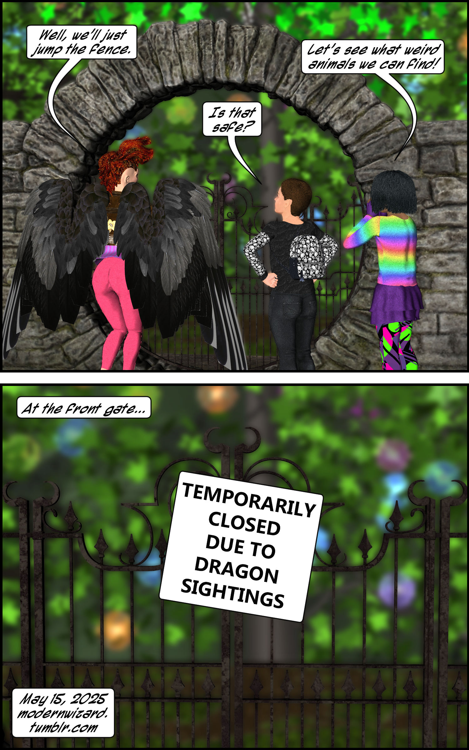 Isn’t a dragon a weird animal? And, how come they are at the back gate? Uh oh!