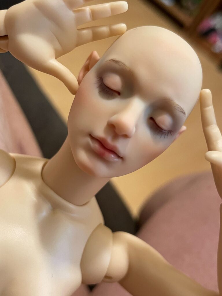 I bought Pine, a Bardo Research Anitya with awake and sleeping faceplates, about a week ago for $1802.95 shipped because I really loved her sleeping faceplate and because, for once in my life, I could afford to drop that much on a semi-impulse purchase. I also just really wanted something to make me happy right now, and her sleeping faceplate’s expression really spoke to me. The expression seems to blend concentration and effort with relaxation, stillness, and tranquility. At the same time, the expression also reads as wistful, melancholic, or nostalgic. I interpret the expression as one in which the person is trying hard to maintain balance despite distractions. An alternative interpretation is that the person is trying to meditate but is experiencing distracting thoughts. Plus I love her affectionately and delicately molded ripples of flesh.