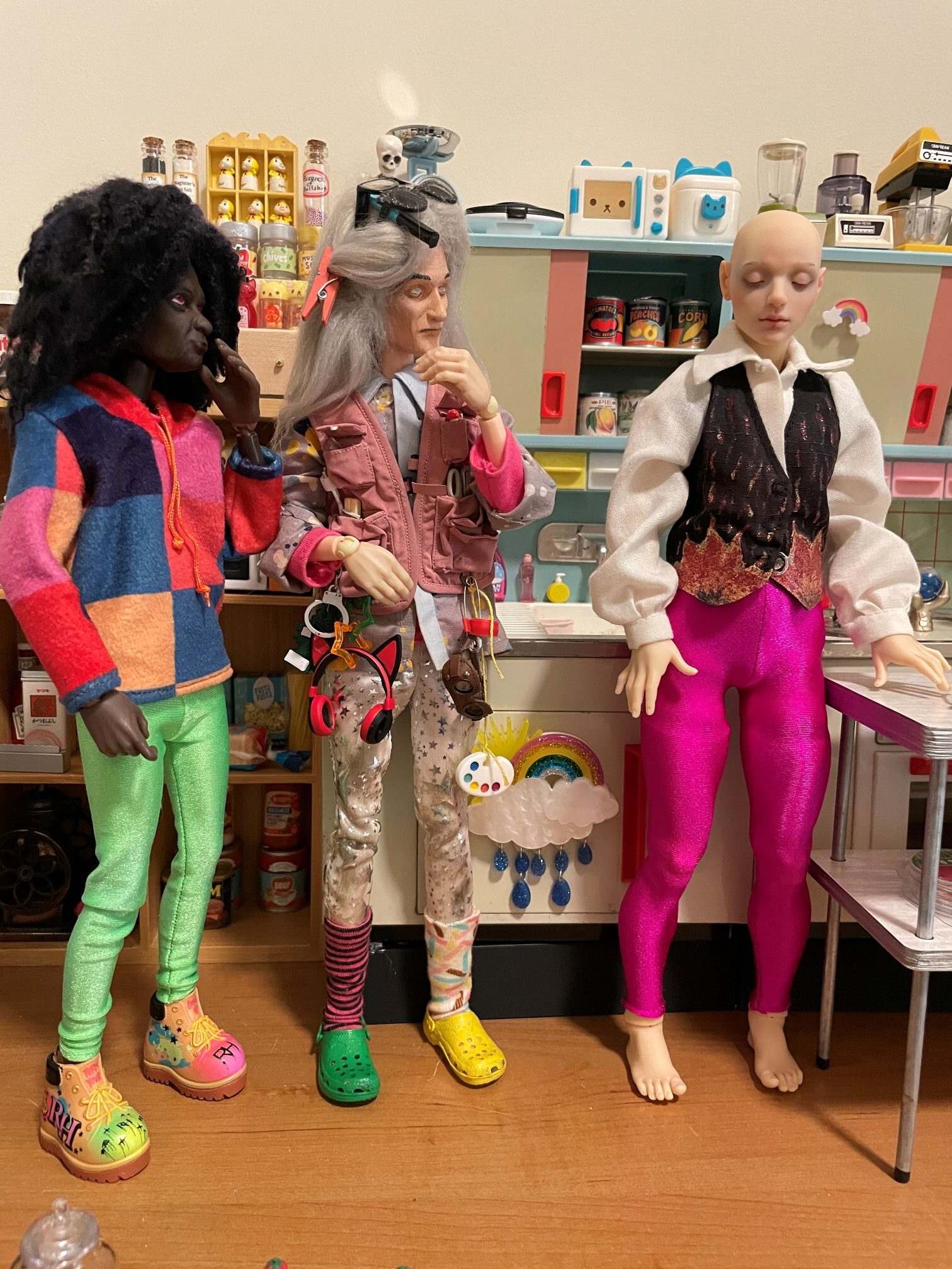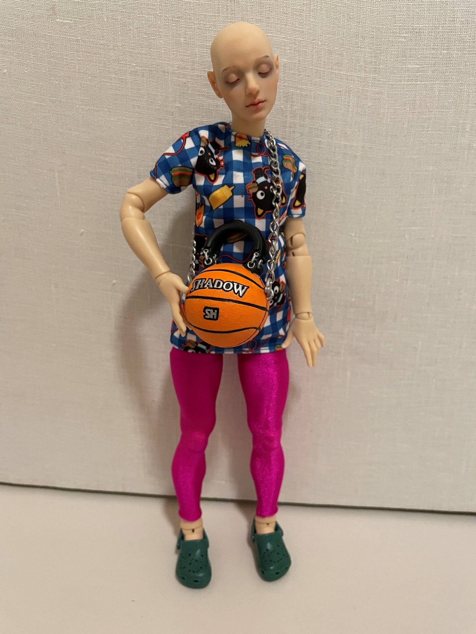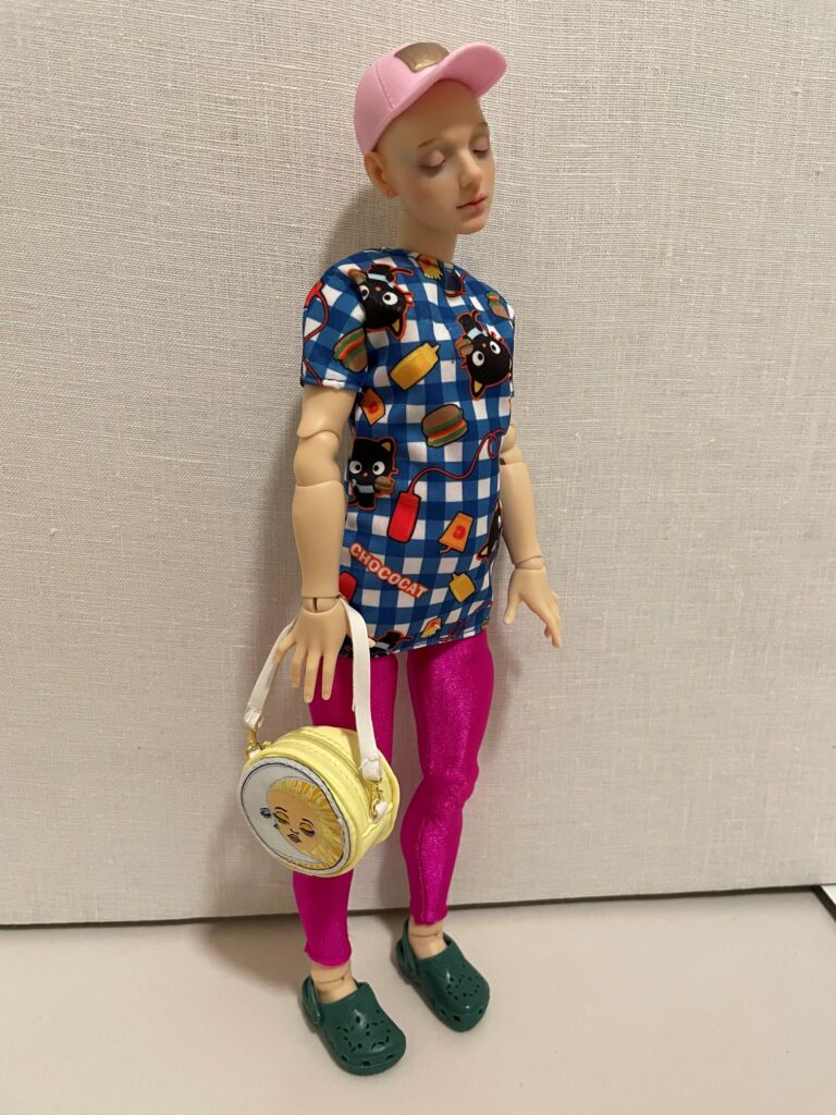 As I was figuring out what Pine should wear to Otakuthon, I first gave her a DollsAhoy blouse with integrated vest that I’ve had for like 25 years [second pic]. Then I tried a Mattel Sanrio Chococat dress for the top and added an MGA Rainbow High Shadow High basketball bag [third and fourth pics] and generic 1:6 scale plastic green clogs. As much as I liked the basketball bag [custom painted orange by someone else], it did not match her personality as much as the Rainbow High bag with the sun and moon on it. I added a Zuru Mini Fashion baseball cap because I don’t want to cover her beautiful skull with a wig, and she was ready to go [fifth pic].