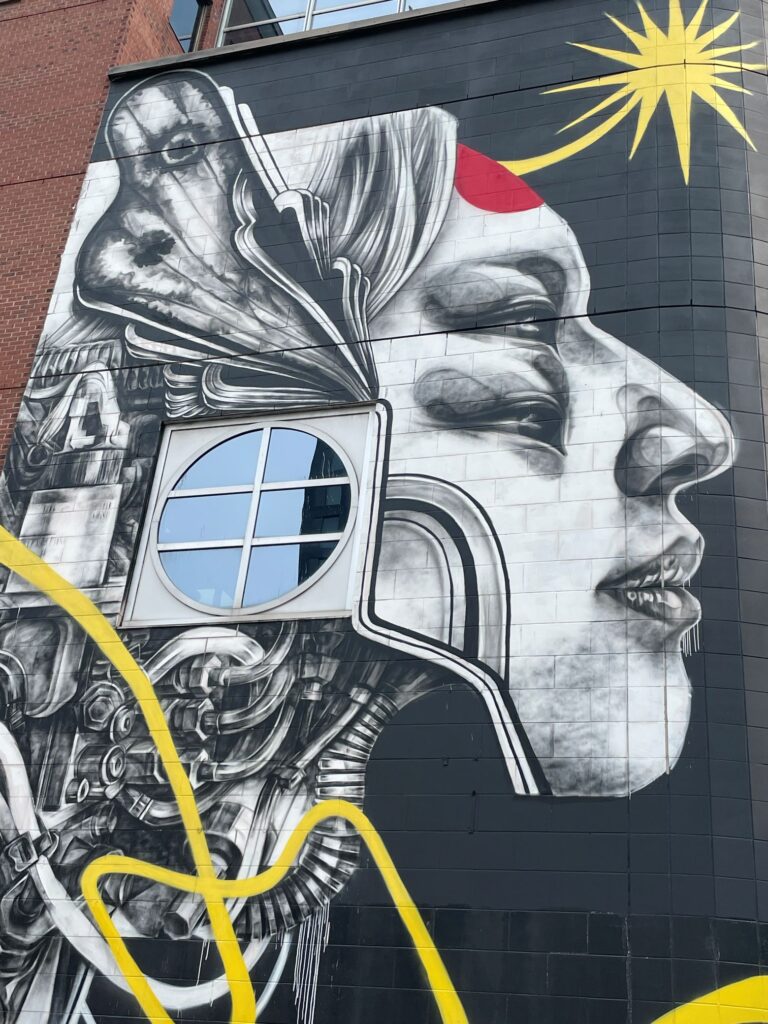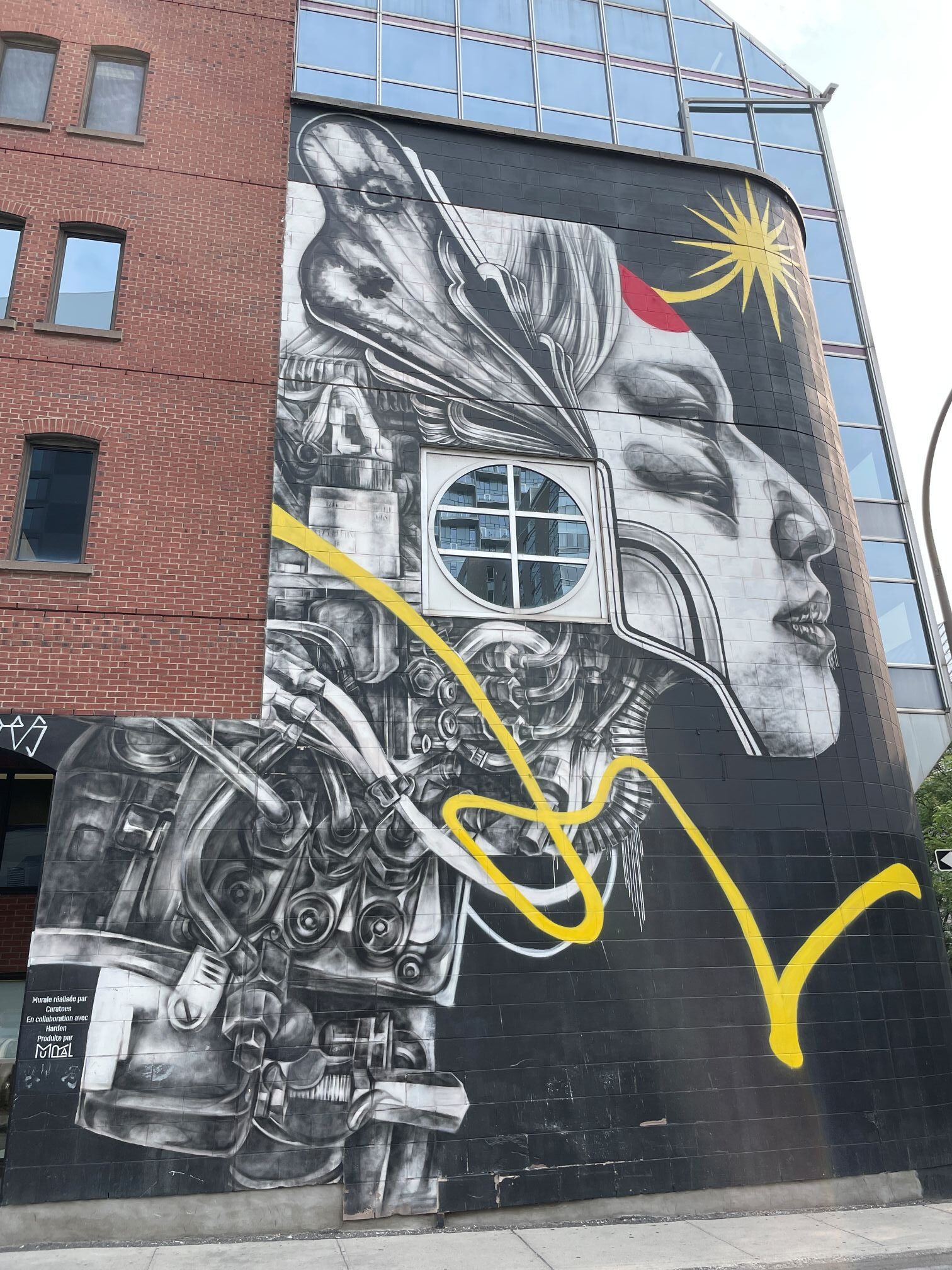 After mediocre continental breakfast at the Travelodge, we moseyed through Chinatown to the Palais. I saw a very cool mural at the intersection of Avenue Viger Ouest and Rue Jeanne Mance.