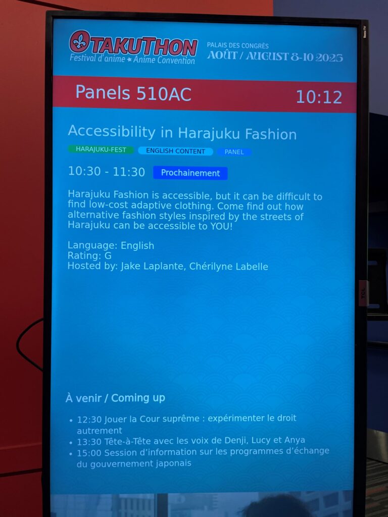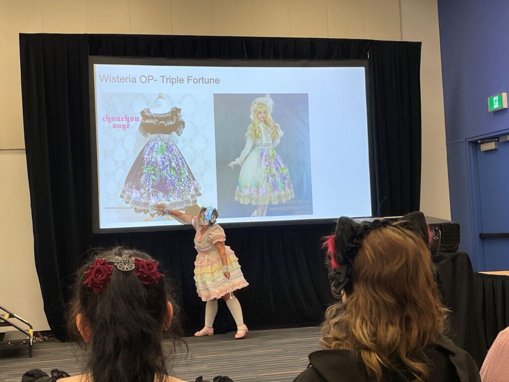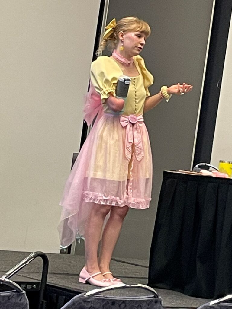 Otakuthon started at 10 am, and we attended our first panel of the day: “Accessibility in Harajuku Fashion.” It was hosted by Cherilyne Labelle, whose cohost Jake Laplante was unexpectedly absent. Despite doing the entire presentation singlehandedly [“The only hand I have!” Cheri joked], Cheri covered a huge range of ways to make Harajuku fashion adaptable to different body shapes, weights, abilities, sensory needs, and budgets. She focused on adapting fashions for disabilities because she has a congenital limb difference, but she also gracefully covered shopping for trans and gender-nonconforming body types, which Jake would have covered from a first-person perspective. I loved her opinion that your clothes should fit you, not the other way around. In other words, clothes should be adapted to one’s body as it is. One should not adapt one’s body to a piece of clothing.