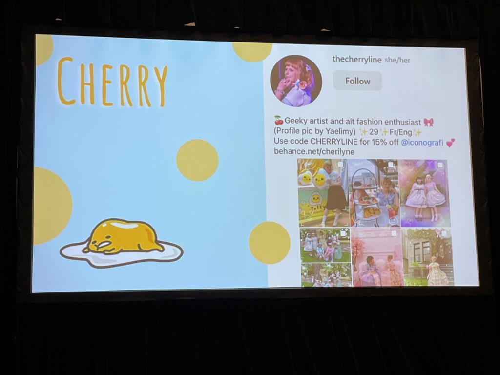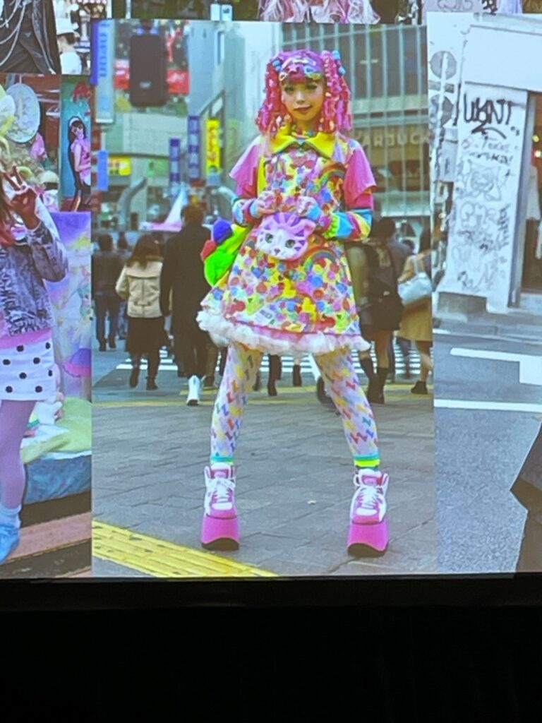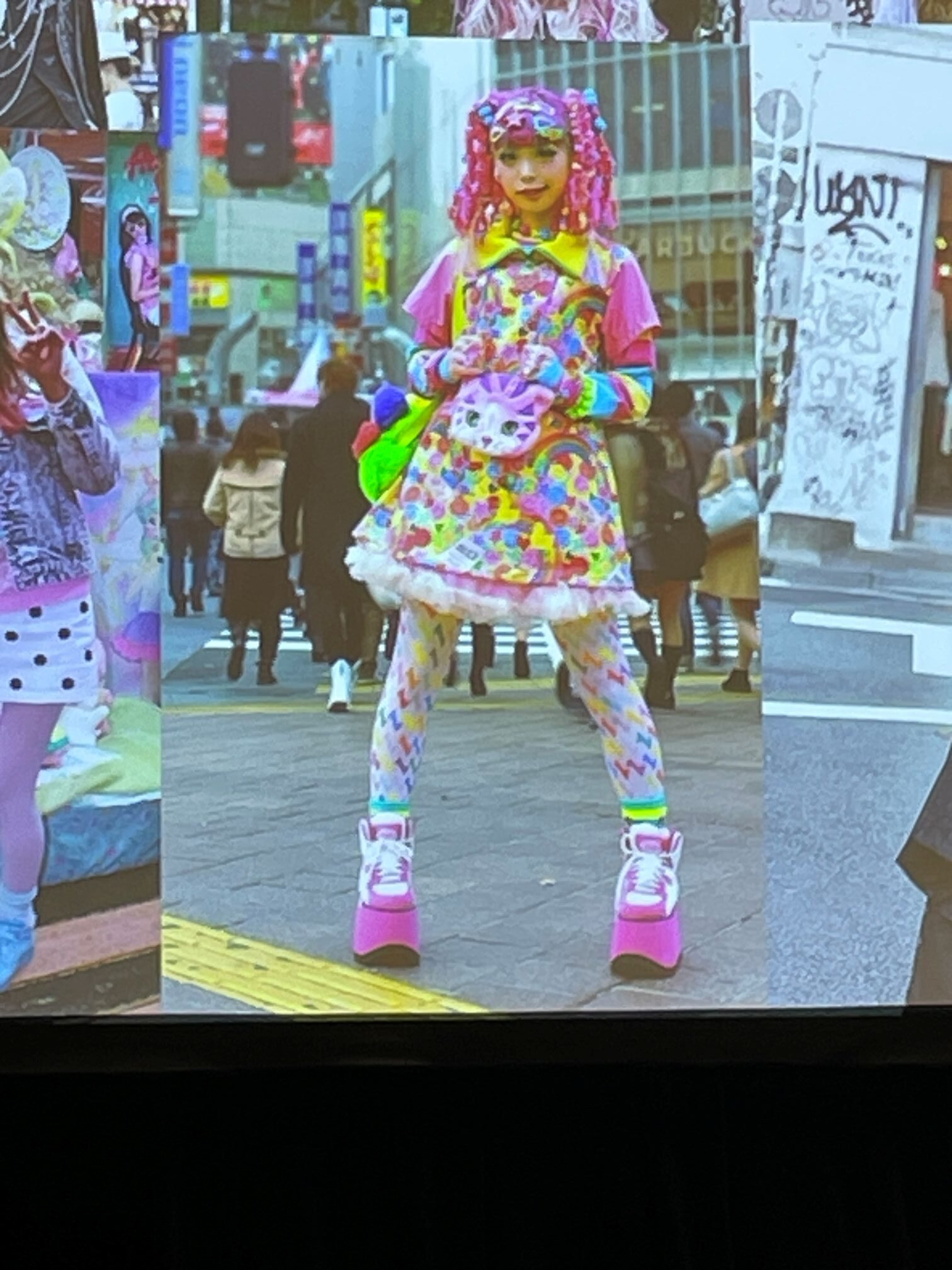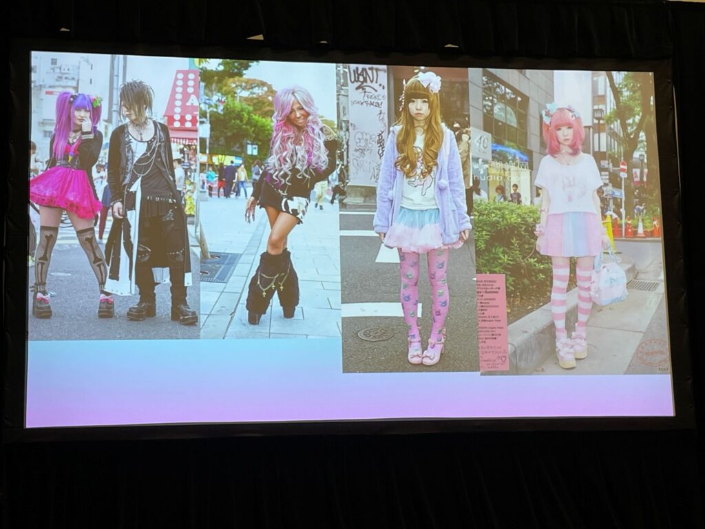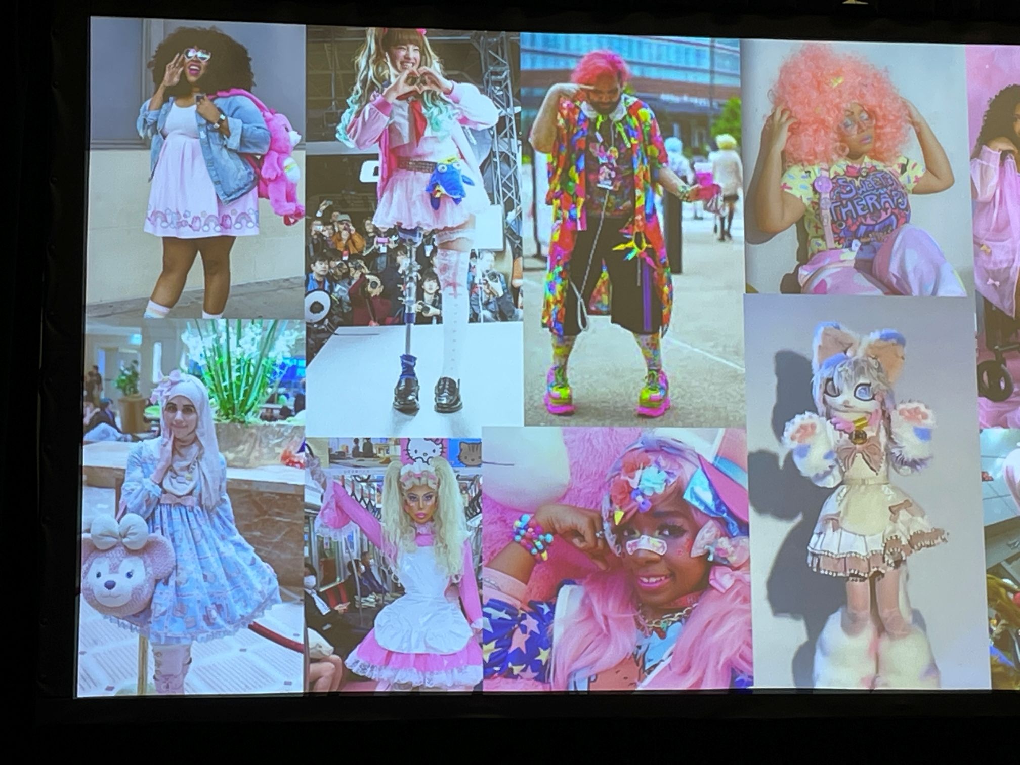 Photos show the screen outside the panel room, a typical arrangement for a panel room, presenter Cheri wearing a lovely yellow romper with a pink tulle overskirt and holding her coffee but not drinking it even though she repeatedly remarked that she needed to, Jake and Cheri’s social media information, some slides of Harajuku fashion that I really liked, and a list of brands, compiled by Cheri and Jake, recommended for inclusivity.