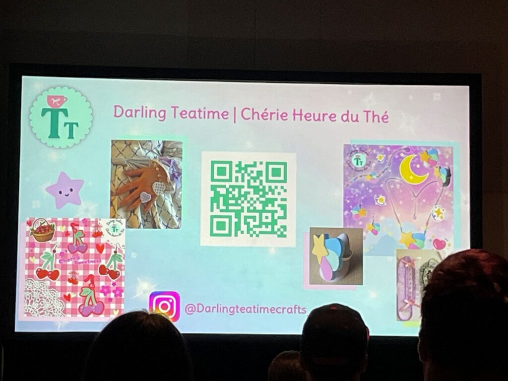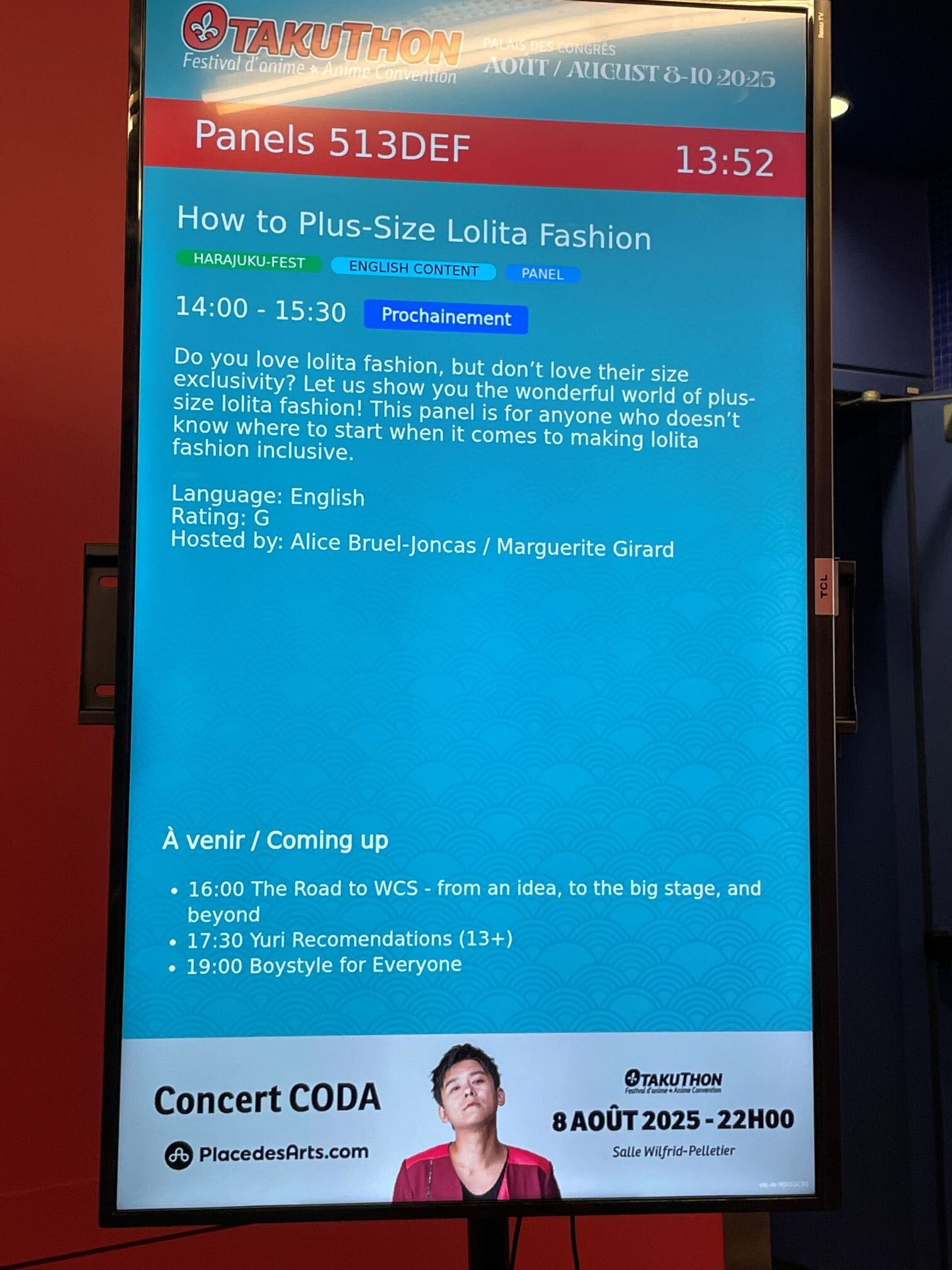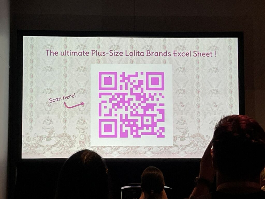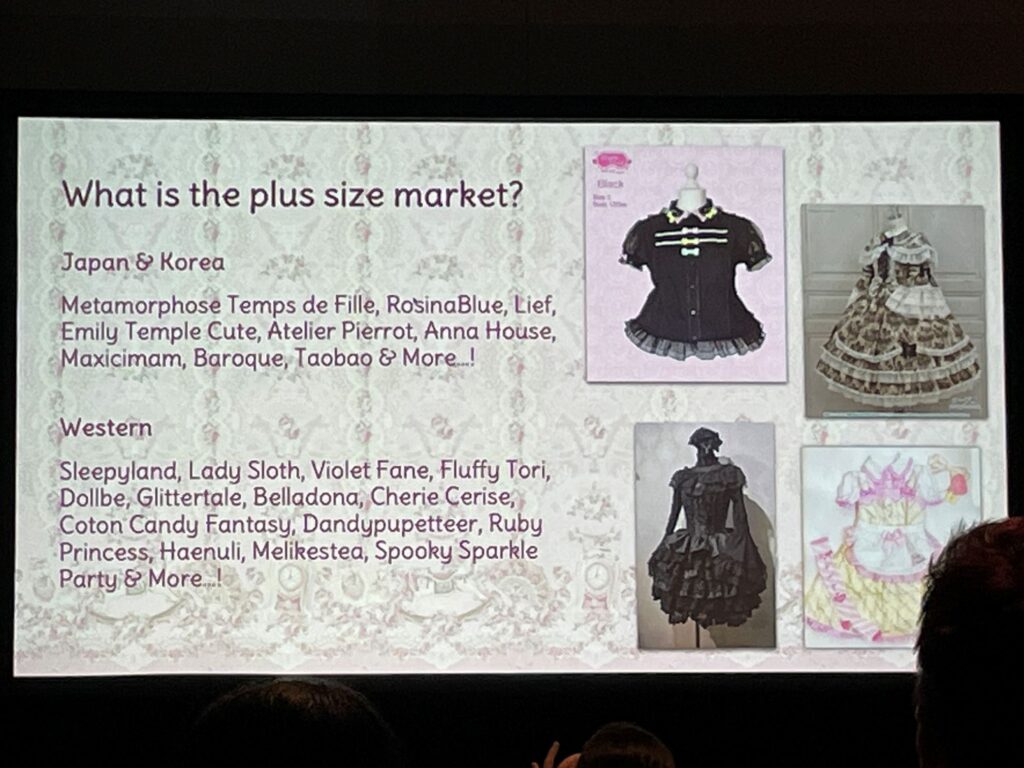 Our next panel was at 2:00 pm: “How to Plus-Size Lolita Fashion,” hosted by Alice Bruel-Joncas and Marguerite Girard. Sharing their personal experiences about finding and altering Lolita styles to fit bigger bodies, they also interviewed Darling Teatime, a local tailor specializing on Lolita. Darling Teatime’s social media information appears in one of the photos below, as does a list of brand suitable for fat people. Echoing the message relayed by Cheri, the hosts of this panel emphasized the enjoyment and confidence derived from wearing clothes that one likes and feels good in. They too said that the clothes should fit the person and not the other way around. We enjoyed this panel and, as a wonderful bonus, saw many people in Lolita garb, so I got quite a few pictures of people’s elaborate outfits.