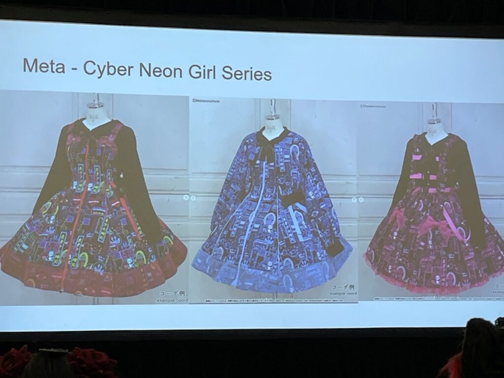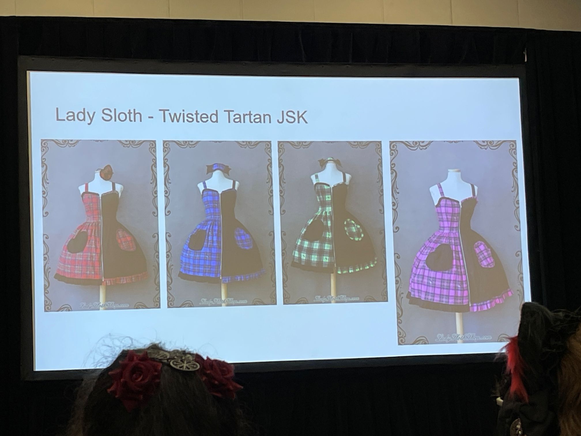 We returned to the dealer room for a few quick circuits and then attended our favorite panel, “Lolita Toot and Boot 2025 Edition,” hosted by friends Sofie Lamontagne-Cumiford and Alice Brunel-Joncas, from 4:30 to 5:30 pm. They showed us slides of Lolita dresses released this year, and we all yelled out whether we liked them or not and why. The hosts kept up silly, sweary banter with each other and enjoyed gesturing at each other and audience members with their pointers. Pictures below show Sofie analyzing an outfit on one of the slides. There are also some outfits that I liked: Metamorphose de Fille’s Cyber Neon Girl dress, especially the one on the left, and Lady Sloth’s Twisted Tartan JSK [or jumper skirt, a sleeveless dress]. The Cyber Neon Girl dress appeals to my love of Gothy black combined with my flair for obnoxious neon, and the Twisted Tartan is just playful and fun. It reminds me of Mattel’s Monster High doll fashions in all the best ways: a relatively simple concept, but playful and striking.