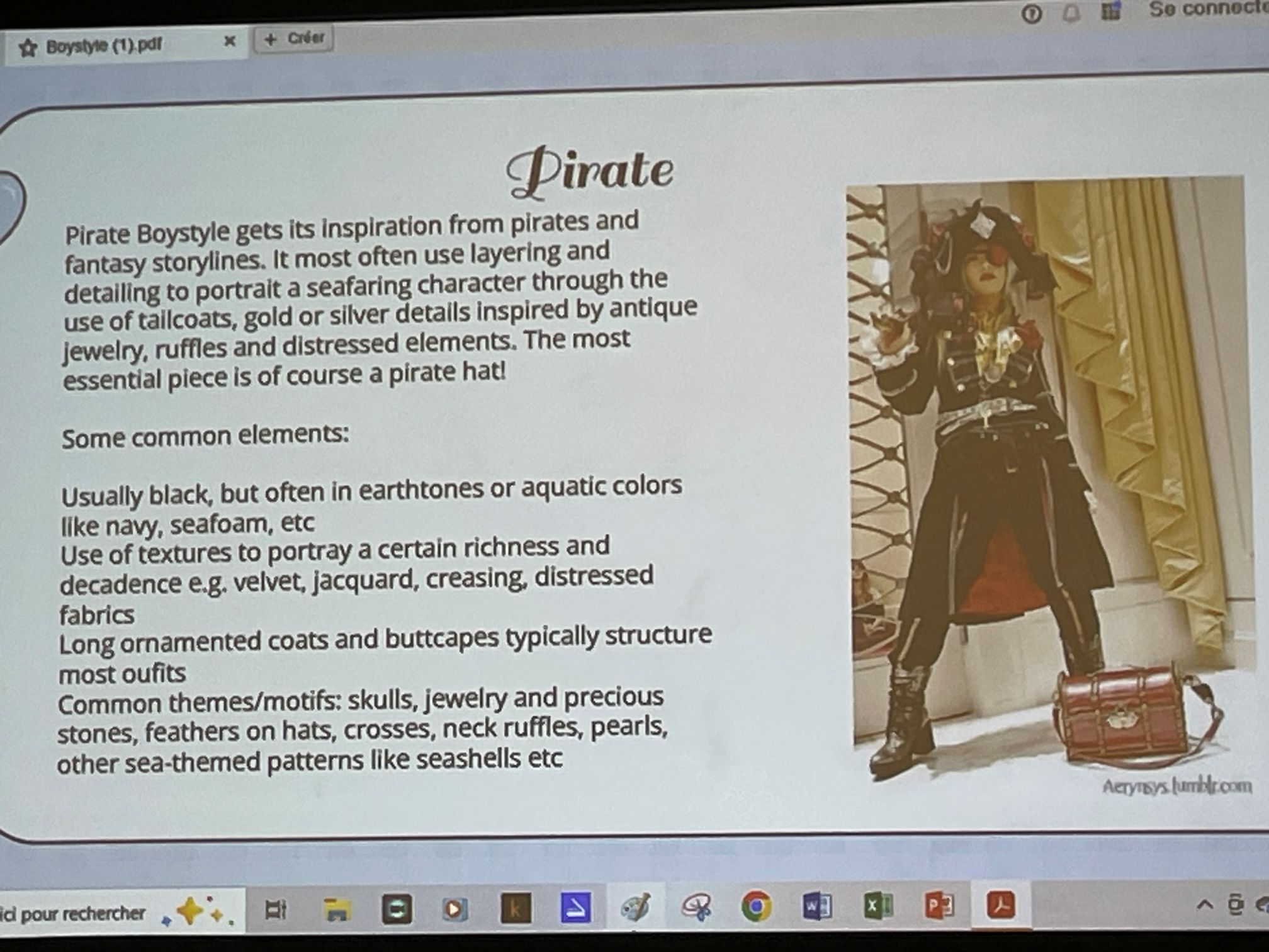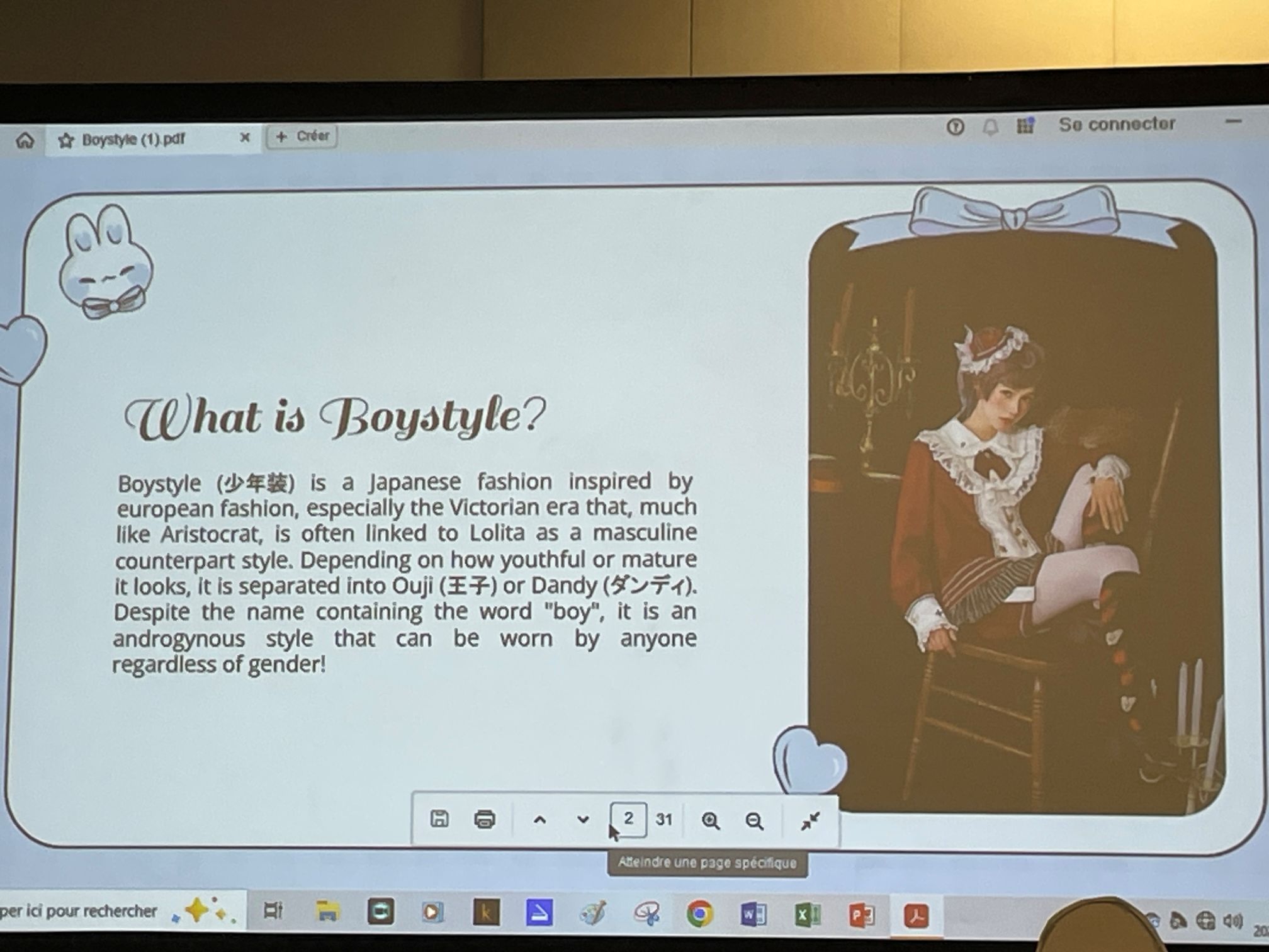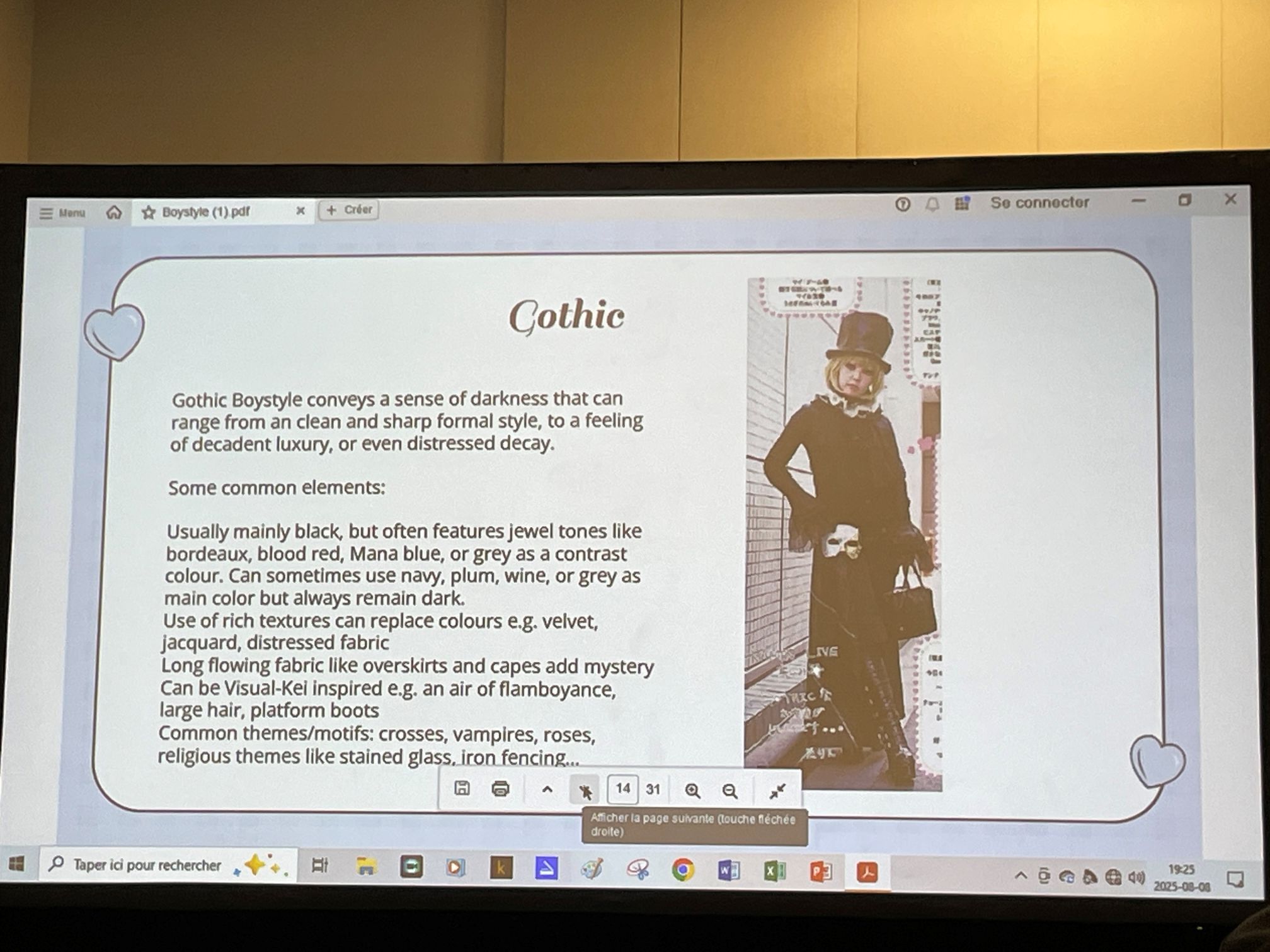 After dinner we attended a panel called “Boystyle for Everyone.” Boystyle, the masculine counterpart to Lolita clothing, romanticizes European royal/Victorian/Rococo style. The presenters, who had clearly not practiced, merely read their slides aloud and did not engage the audience much. I left after 45 minutes, during which they were literally reading a list of links to clothing retailers. I took photos of some slides just for some basic information about the style as well as two substyles that I liked.