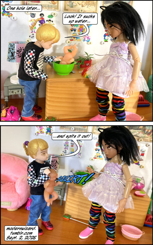 This use of a hollow molded plastic toy is inspired by my similar practice with My Little Ponies to make them piss water out their tail holes. >:)