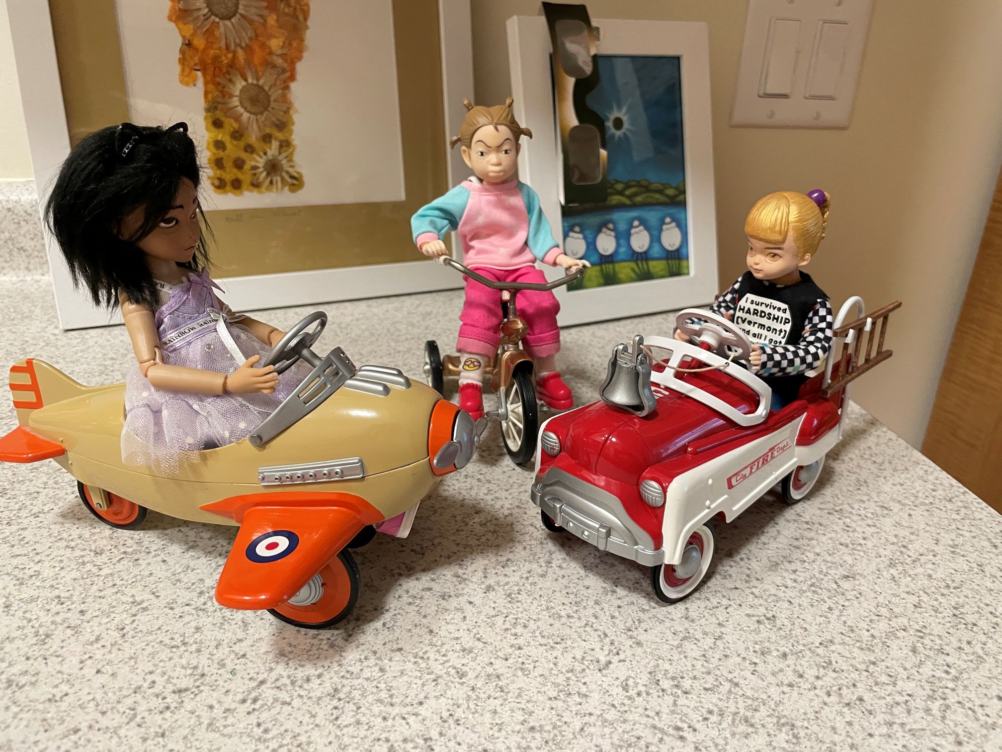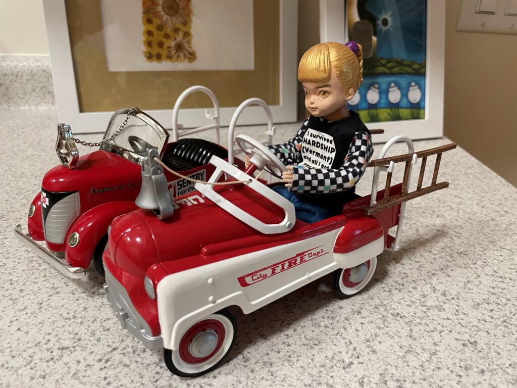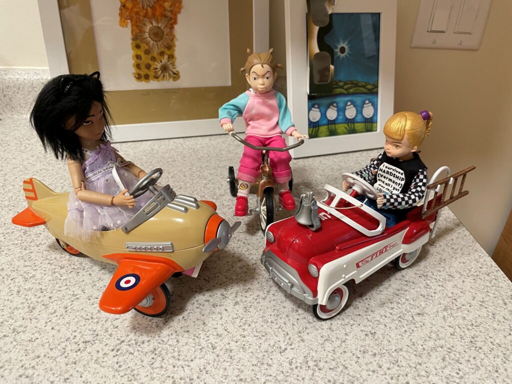 When I first discovered collectible diecast 1:6 scale replicas of mid-twentieth century pedal cars that doubled as banks, I was thrilled because I thought I could use them as toys for my dolls. None of my dolls greater than 7″ high could fit in the car that I got in 2021, though, so I eventually got rid of it.