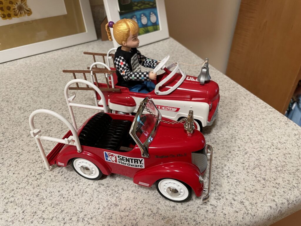 Now I wanted to upgrade the fire engine pedal car replica that I had originally gotten for something that I could more easily use with my dolls. Time to purchase another Hallmark replica, this time of a 1955 Murray fire truck, which arrived today. Comparison shots below.