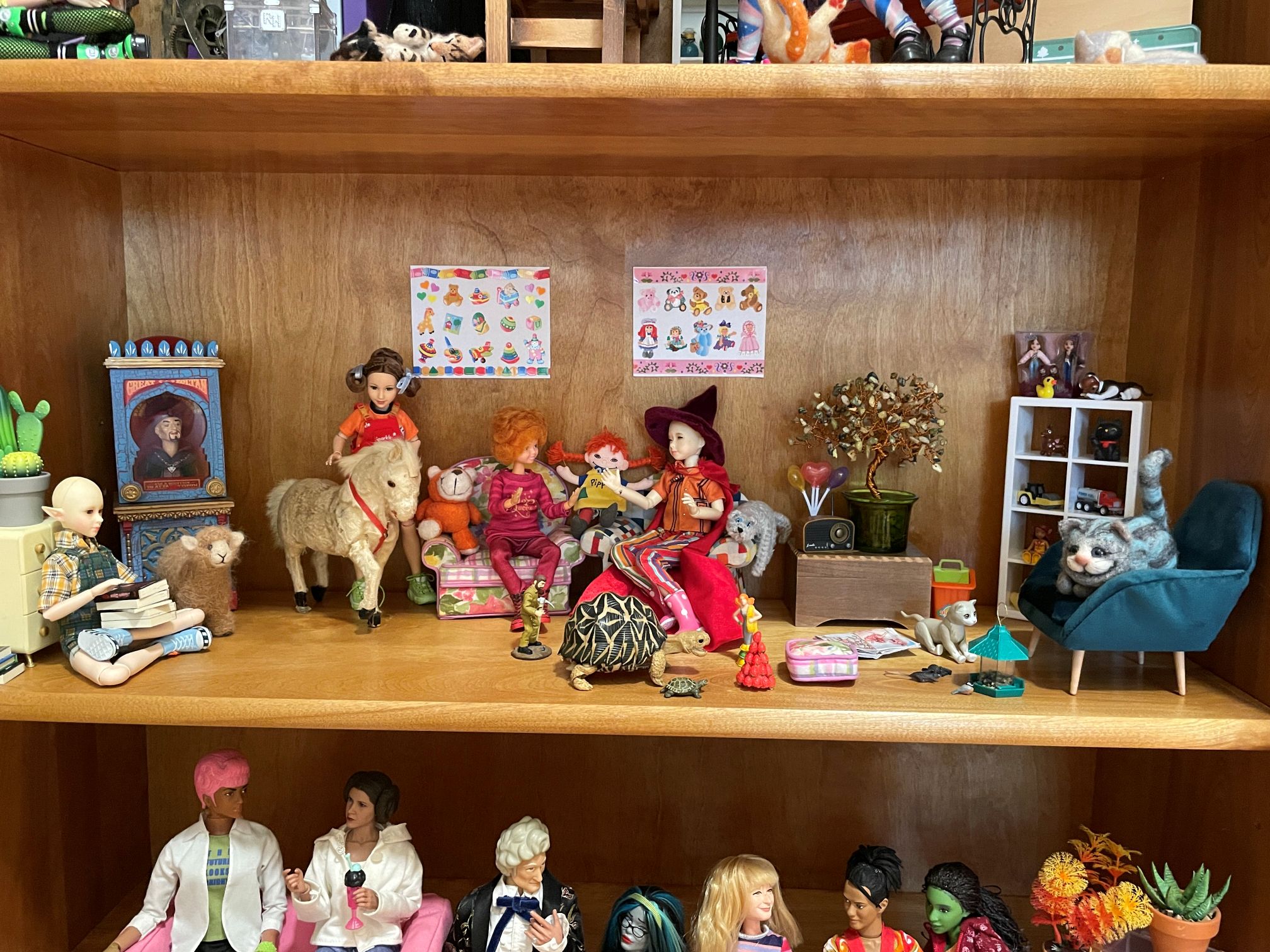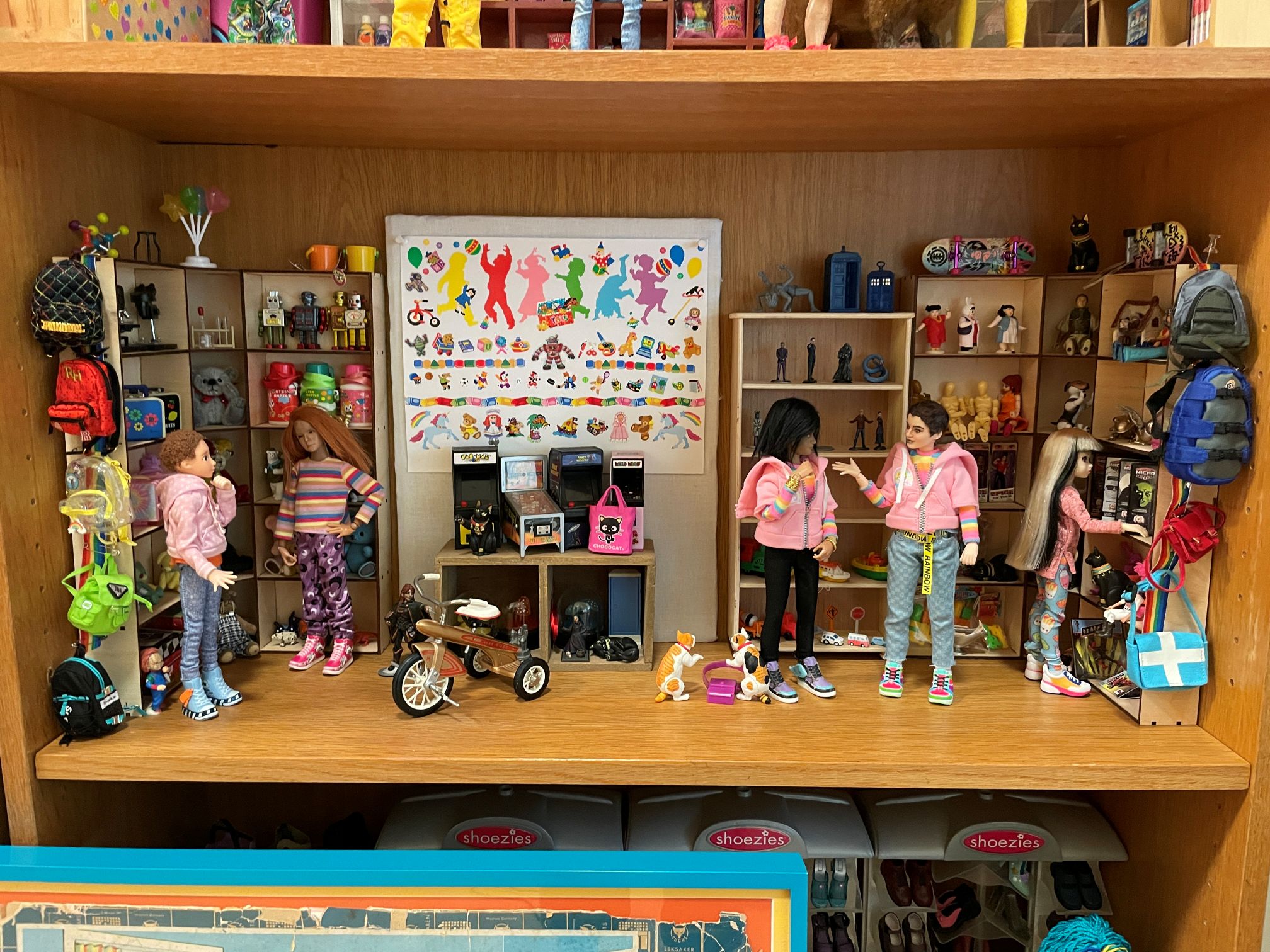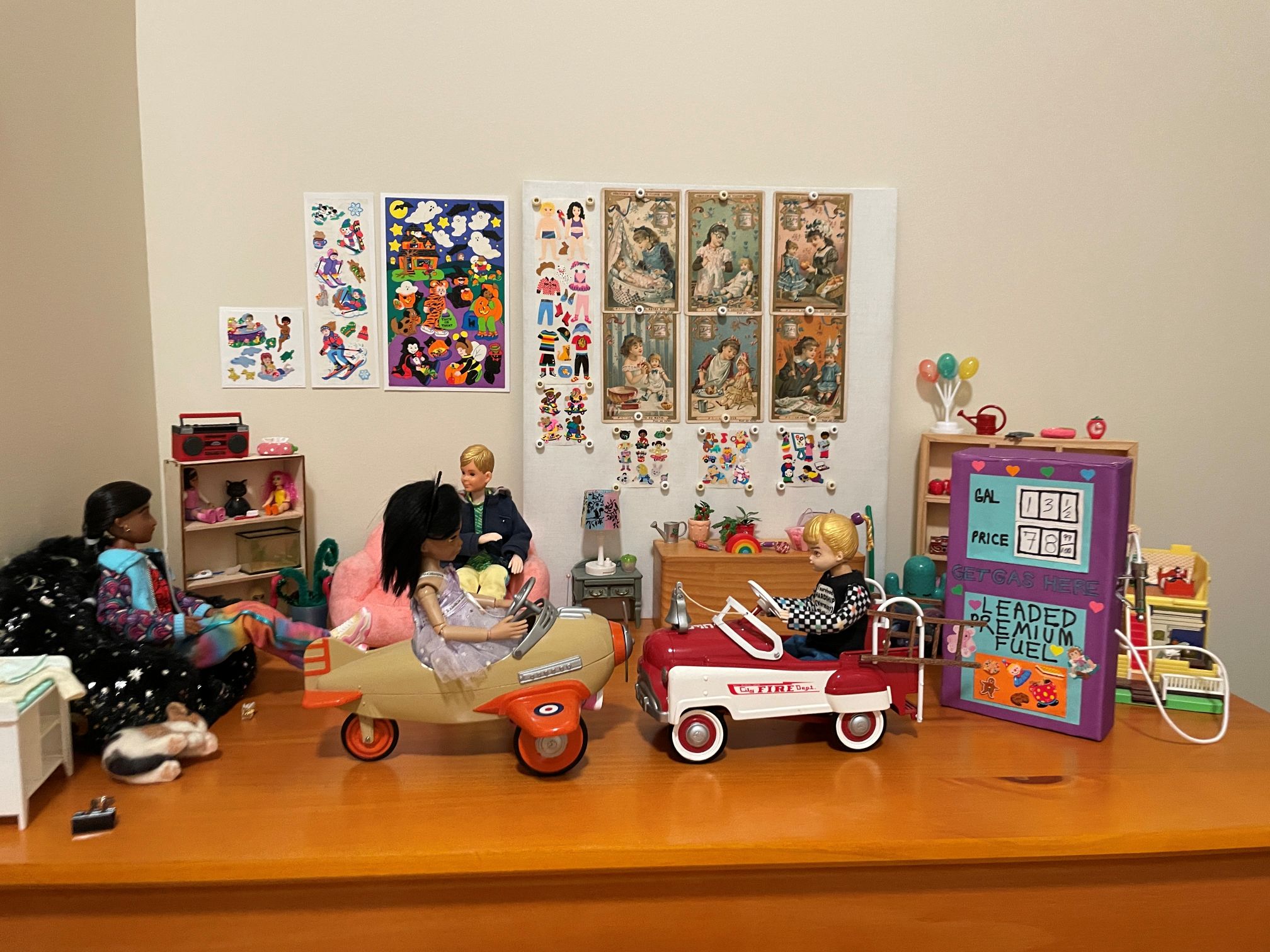 Recently I’ve decorated some doll sets with stickers [mostly Sandylion]. I started on this project because I wanted to put stickers on the walls of my toy store set. I had stuck up a few sheets of stickers and, when attempting to remove them, peeled off the fake wood grain on the back of the bookcase. To cover this up, I decided to make a sticker mural for the wall of that set.