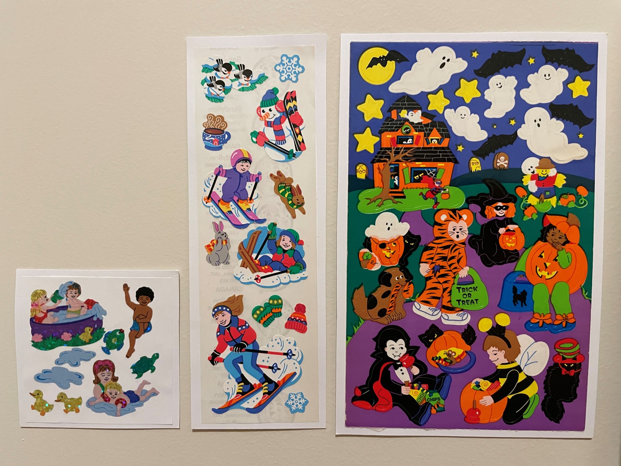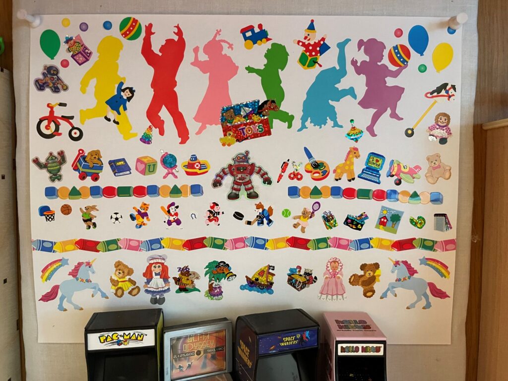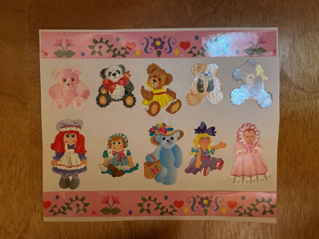 Anyway I bought a bunch more stickers for my sticker decorations. All of them are from the 1980s and 1990s, and most of them are Sandylion. My most favorite ones I left on the original backing, but I did throw together a lot of them to make a poster for the toy store.