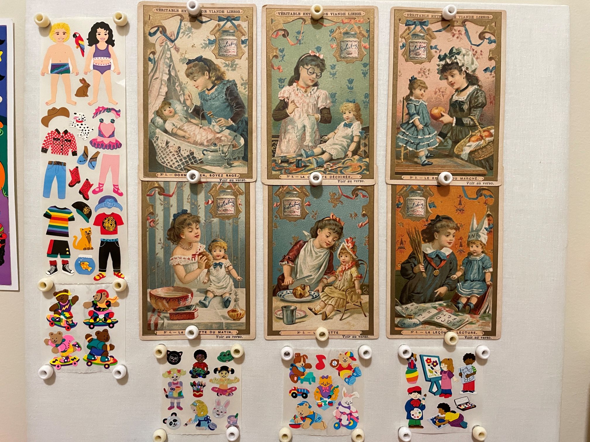 Concurrently I wanted to display some antique trade cards of a girl playing with a doll, but I didn’t want to use tape on them or plastic slipcovers. I covered a stainless steel sheet with white fabric and used it as a display board for the mini dorklets’ play room on top of my dresser in my bedroom. I stuck up the trade cards with magnets. I also displayed some stickers that I had gotten a few years ago when I was making miniature sticker books for my dolls.