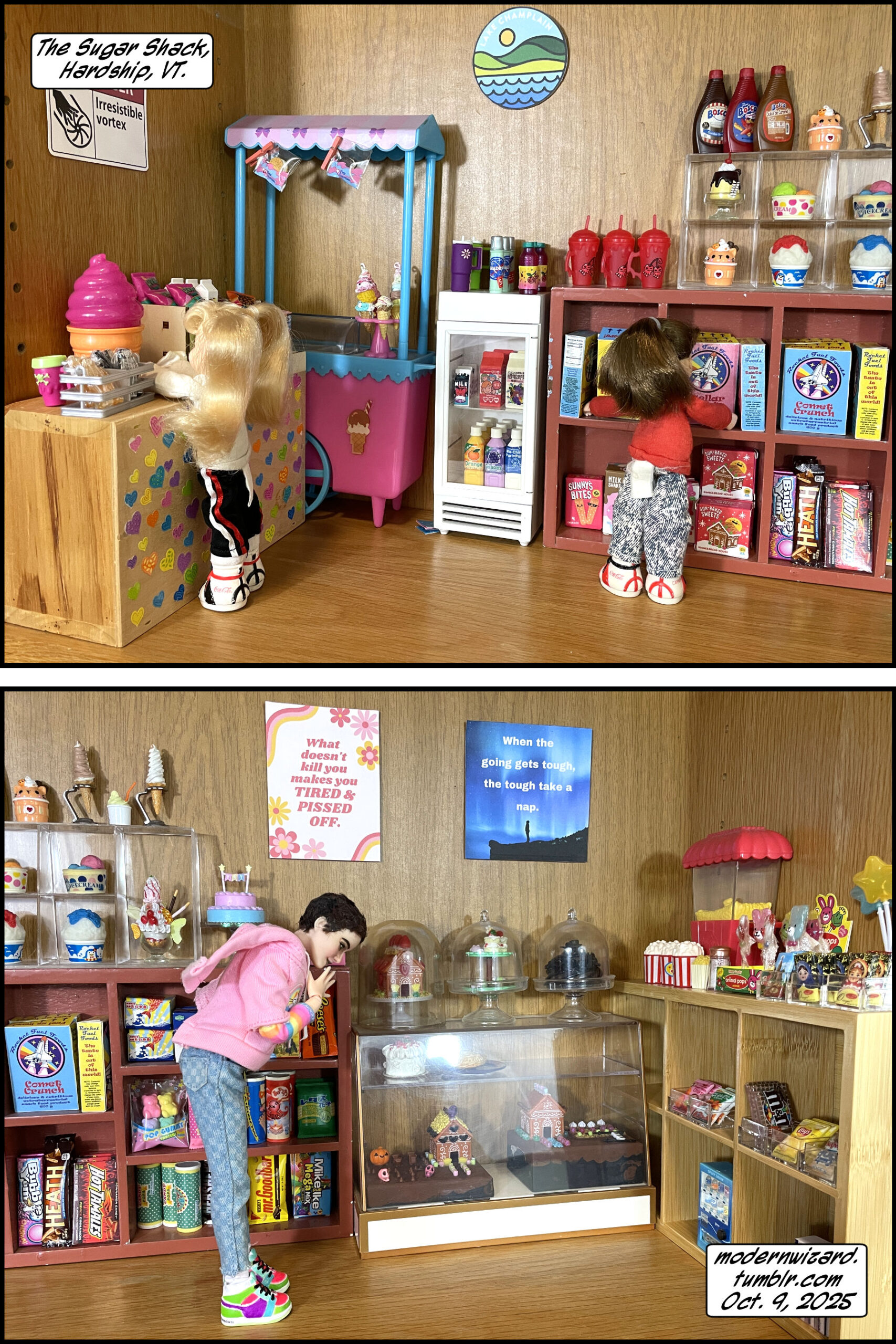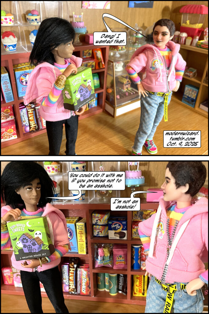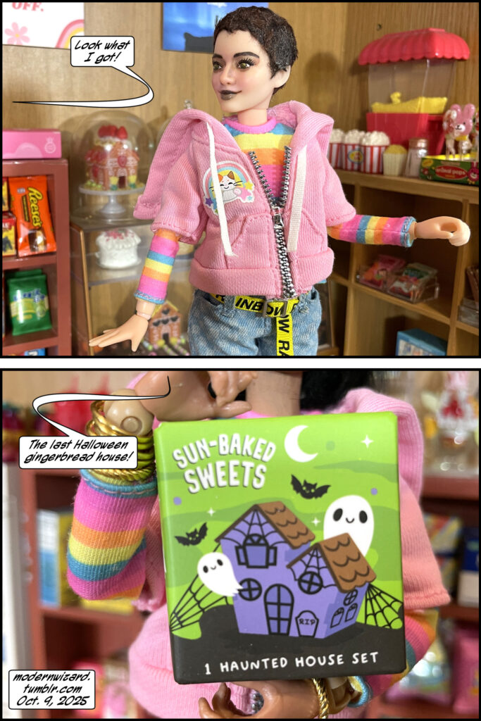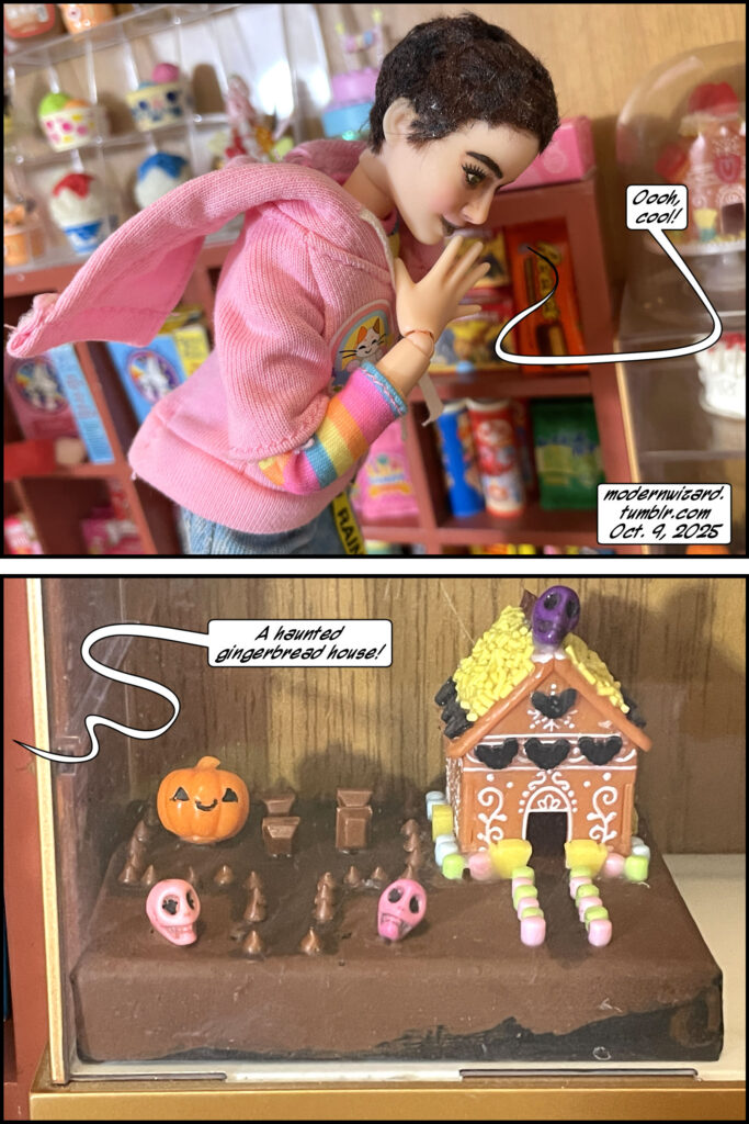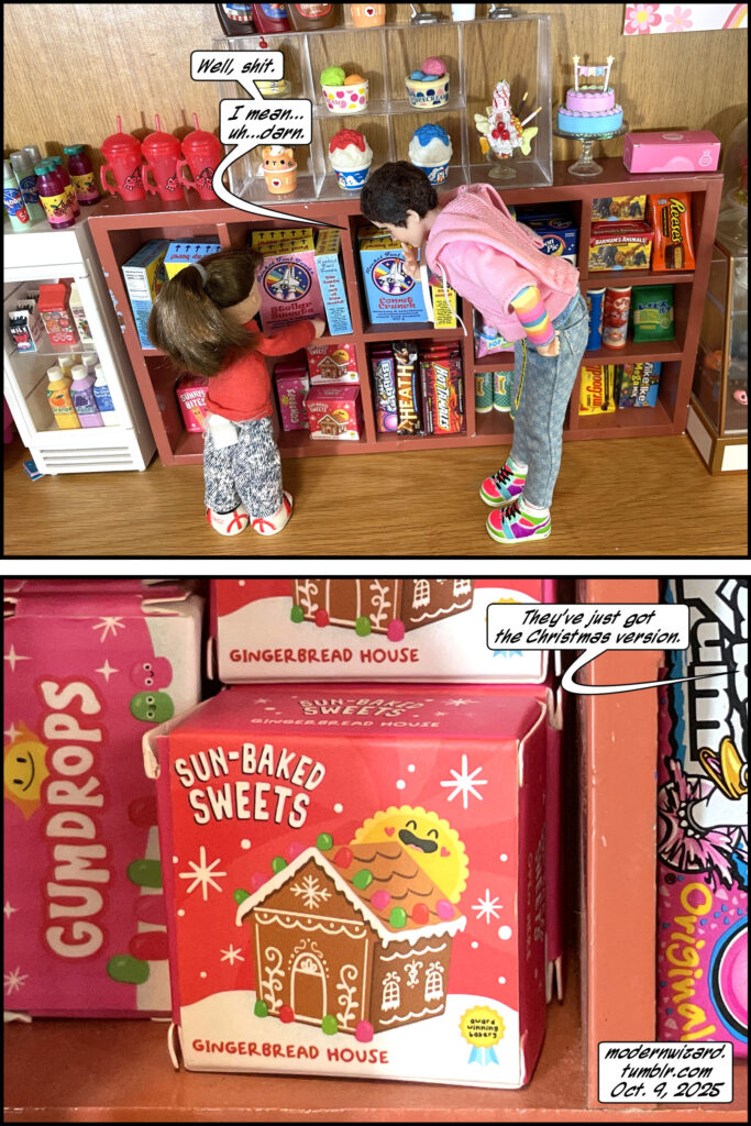 Silencitx and Ethancitx discuss whether they can collaborate on a Halloween gingerbread house without violence. The gingerbread house is from MGA Entertainment Make It Mini Miniverse Halloween series 3. The two little kidsies in the first photo are Ertl Coca-Cola Kids that I recently purchased and restored.